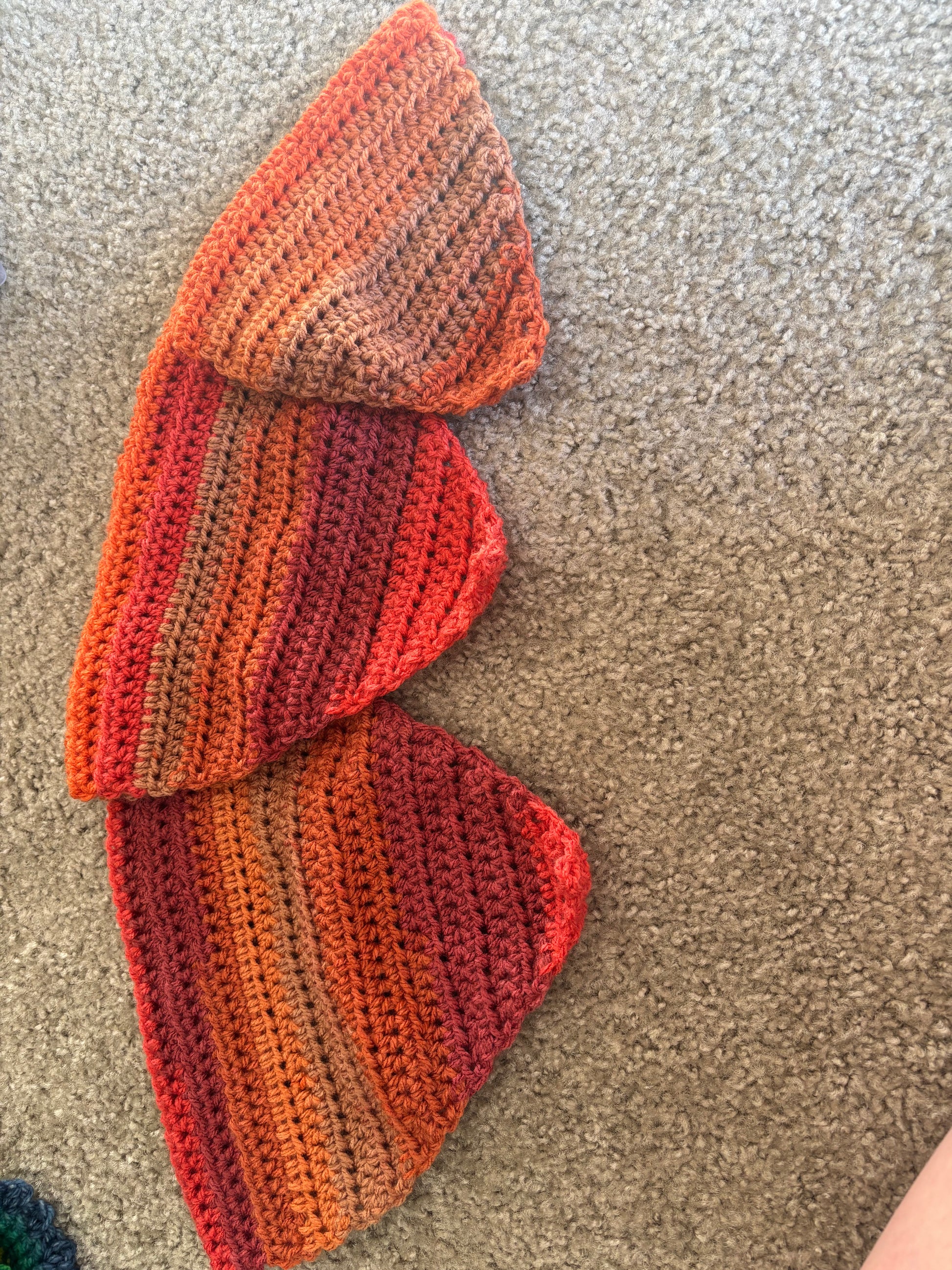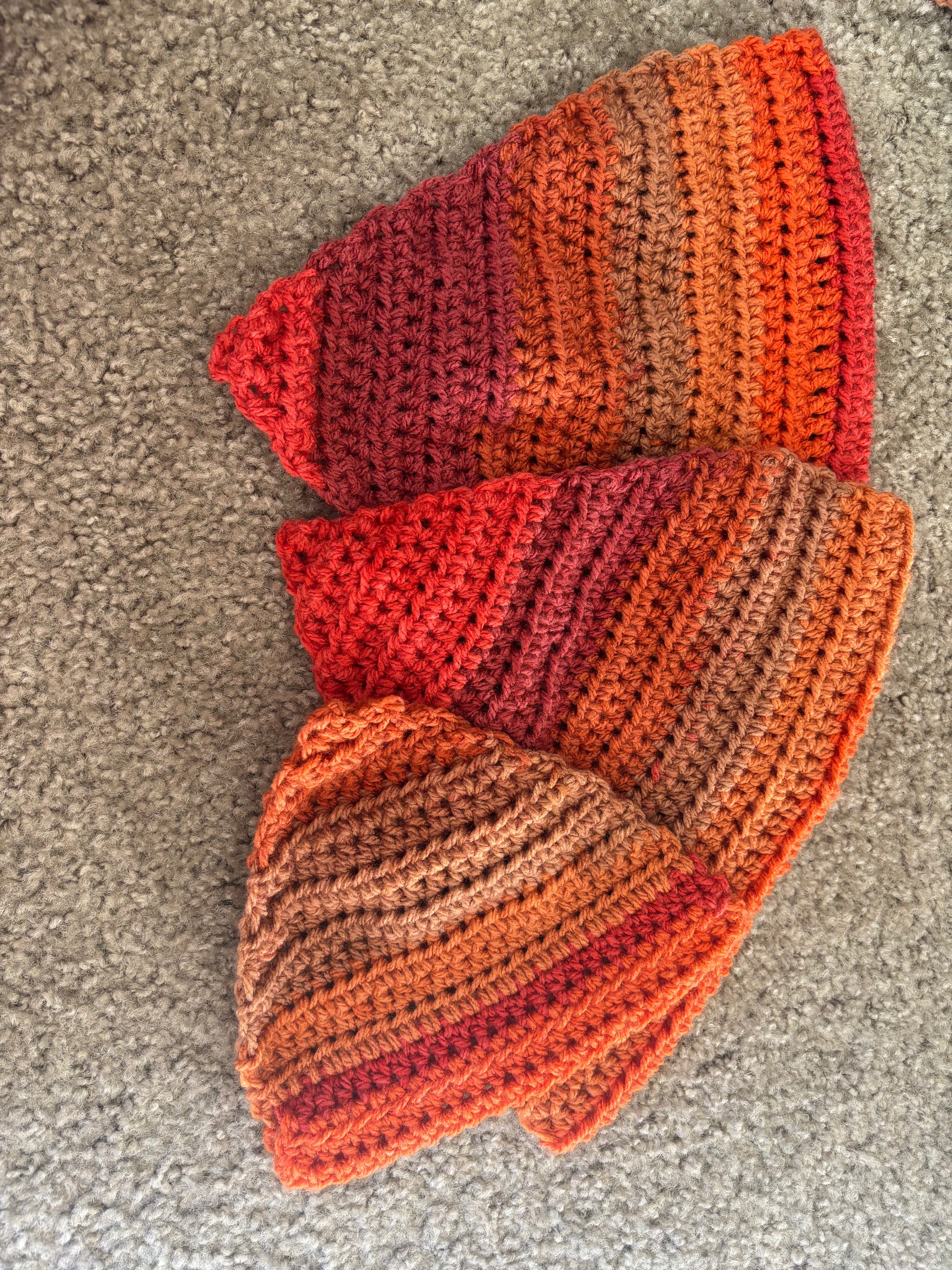 The Heatwave Ember Slip-On Dog Bandana is a bold, fiery accessory inspired by warm sunsets and glowing embers. Handcrafted with Caron Cinnamon Swirl Cake in Heatwave, each bandana features a rich gradient of reds, rusts, oranges, and warm browns that blend seamlessly together. The colorway creates a striking, rustic look perfect for adventure-loving pups.