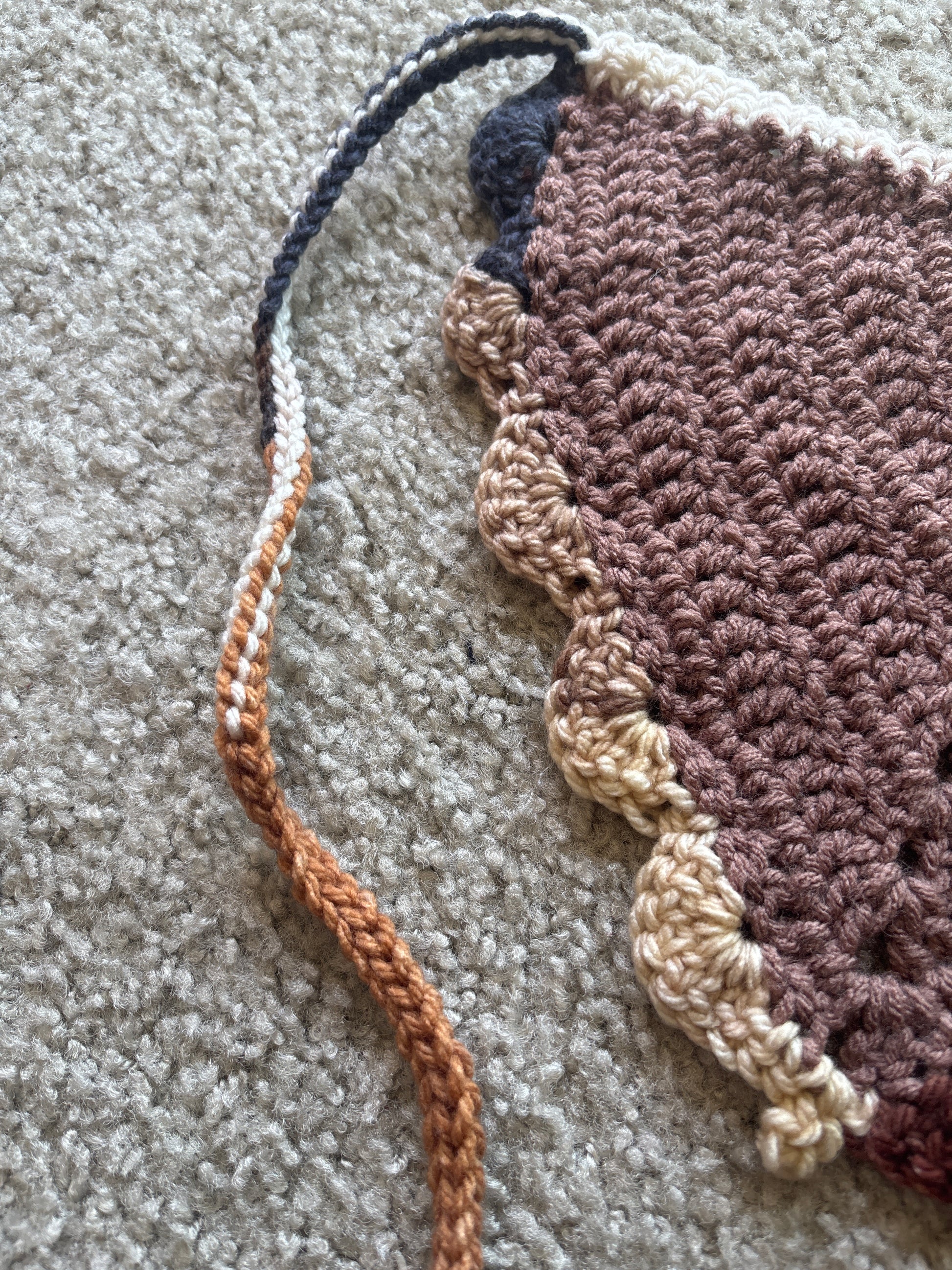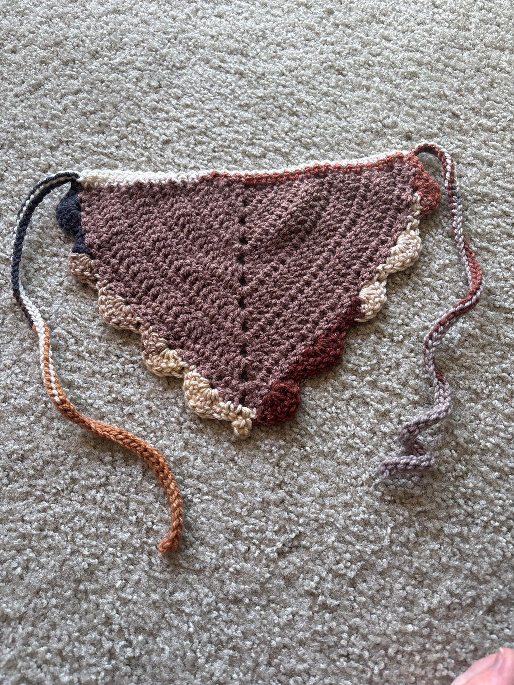 This handmade crochet bandana features rich coffee and cream tones inspired by cozy café vibes. Crafted with a soft triangular design and finished with a subtle scalloped edge, it’s both stylish and comfortable for everyday wear.