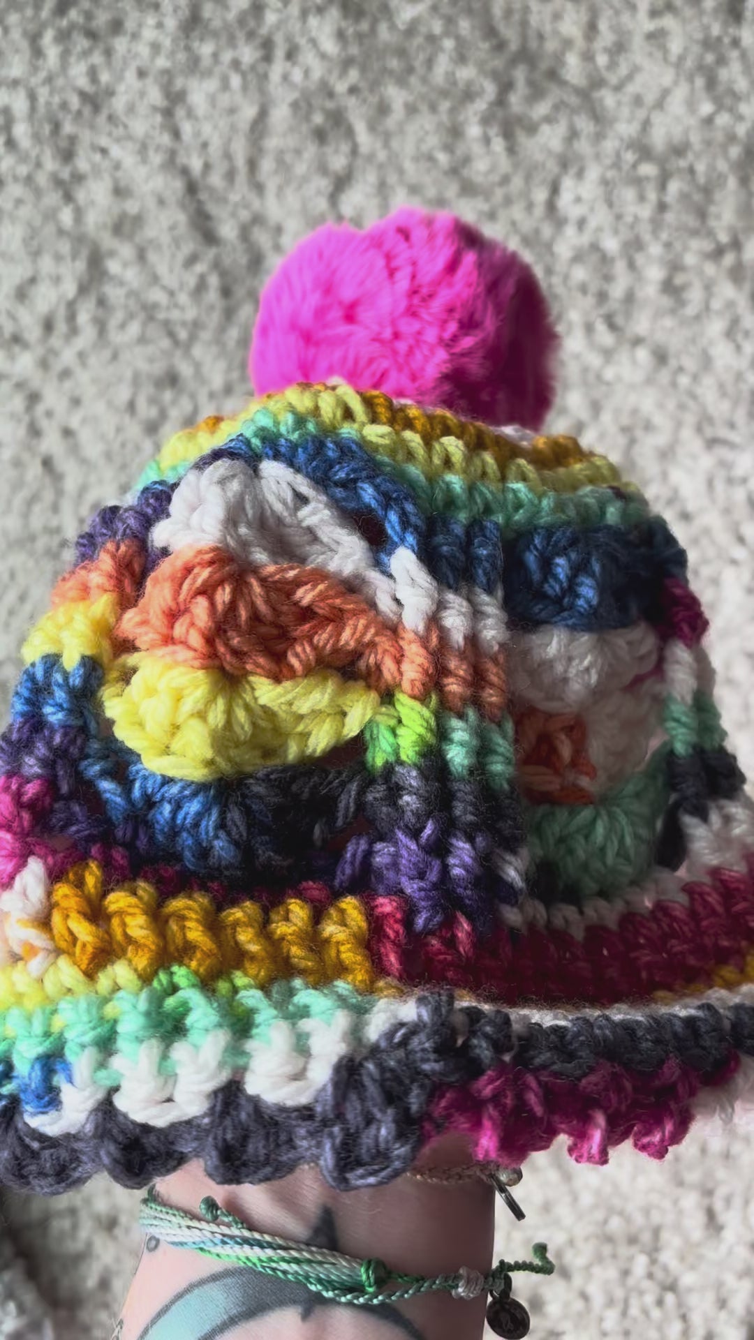 The Kaleidoscope Puff Beanie is a vibrant, one-of-a-kind winter accessory designed to bring color and personality to any outfit. Hand-crocheted with richly textured stitches, this beanie features bold rainbow striping paired with raised cable-style details for depth and movement. The finishing touch—a plush, hot-pink faux-fur pom—adds a playful pop that makes the piece truly stand out.