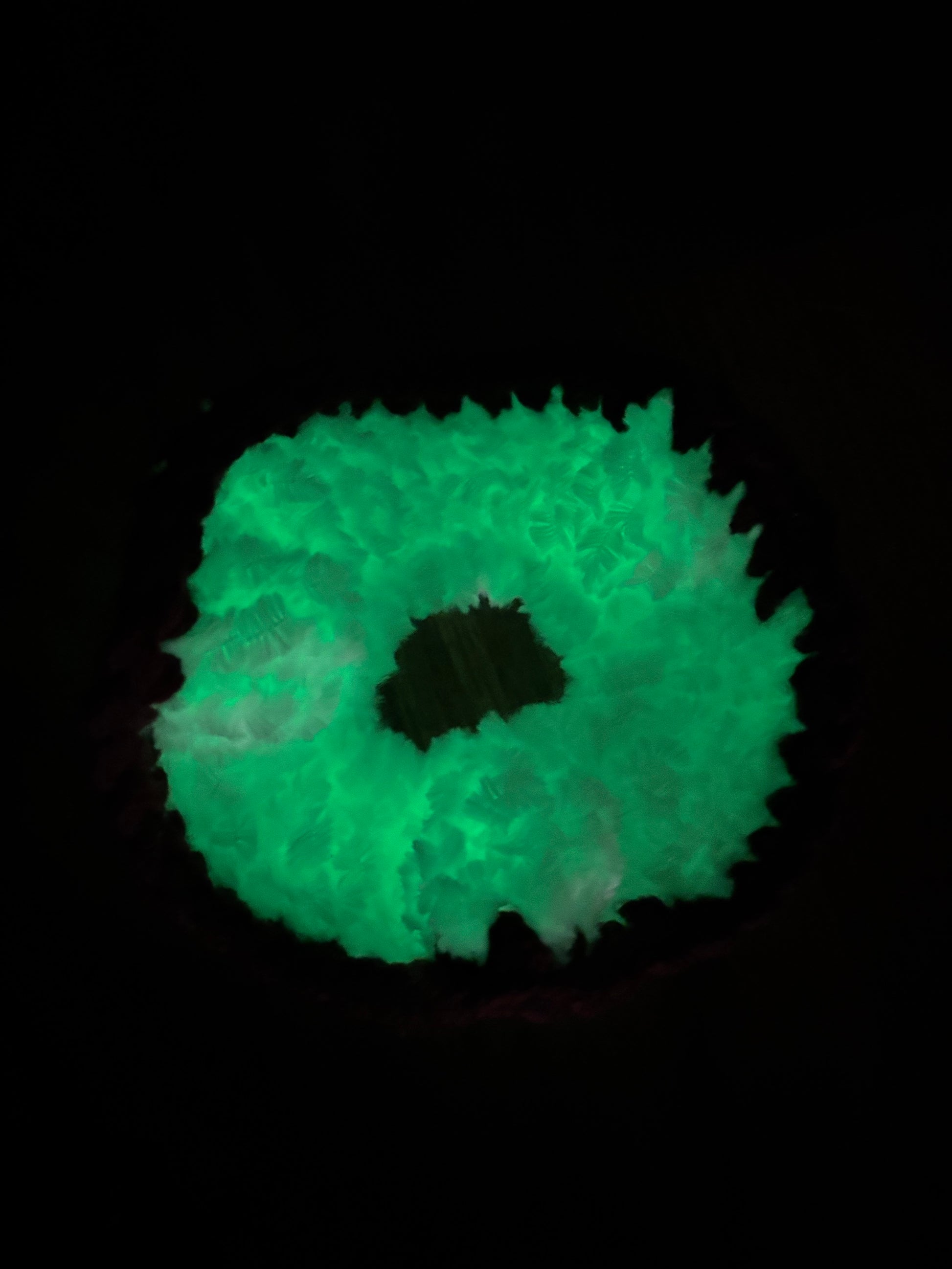 Add a little cosmic charm to your hair with the Lunar Velvet Glow Scrunchie! Handcrafted with Lion Brand’s DIY Glow Chenille in Pearl and finished with a deep red velvet edge, this scrunchie is as soft as it is striking. It absorbs light during the day and glows beautifully in the dark, creating an ethereal halo effect. Perfect for night outs, cozy evenings, or just adding a little magic to your everyday look.